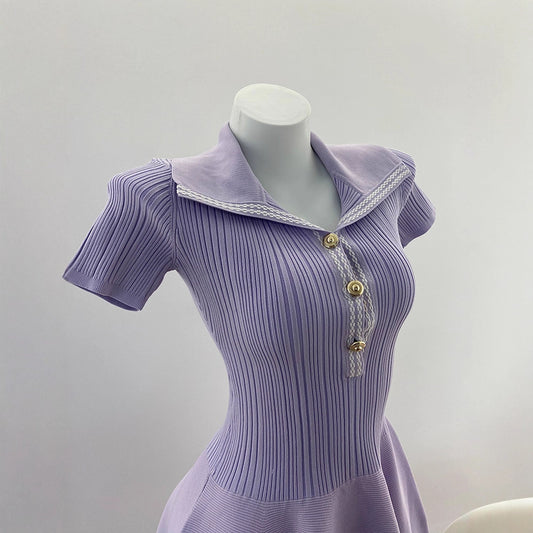 Elegant PurpleShort Sleeve Knit Dress A-Line Flared Skirt