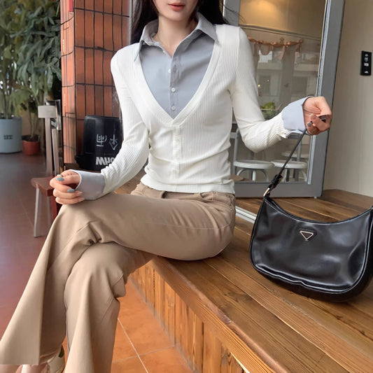 Fake Two-Piece Knit Shirt V-Neck Blouse Layered Fitted Slim Fit Tunic Top